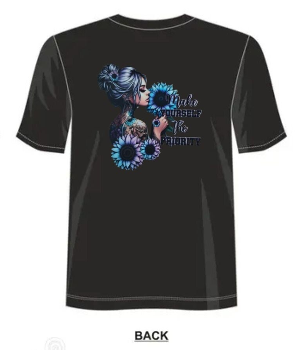 Affirme ton amour de toi avec ce t-shirt au design délicat et puissant. Illustration d’une femme fleurie aux tons bleus, accompagnée du message “Make Yourself the Priority”.