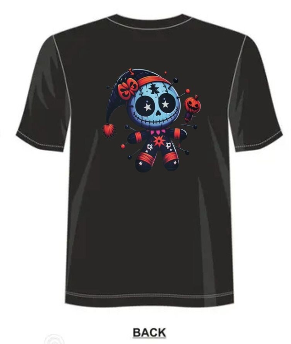 Ce T-shirt 100 % coton t’embarque dans la clique des ombres stylées : une poupée vaudou Halloween trop canon et une vibe spooky qui marque les esprits.
