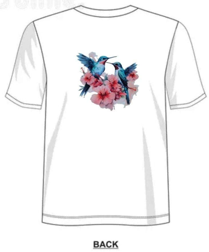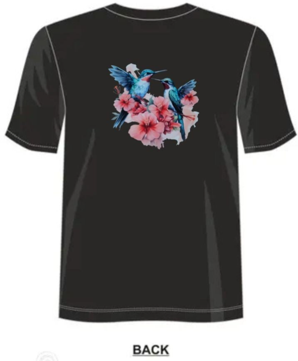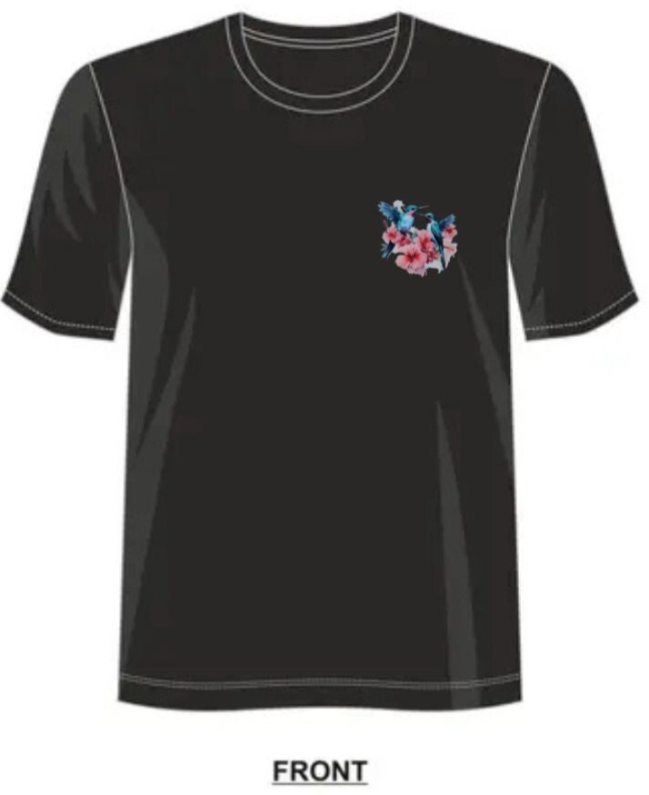 T-shirt 100 % polyester décoré d’un motif élégant de deux oiseaux aux couleurs vibrantes entourés de fleurs. La matière polyester assure une excellente tenue des couleurs dans le temps, pour un rendu éclatant et durable. Léger, confortable et facile d’entretien.