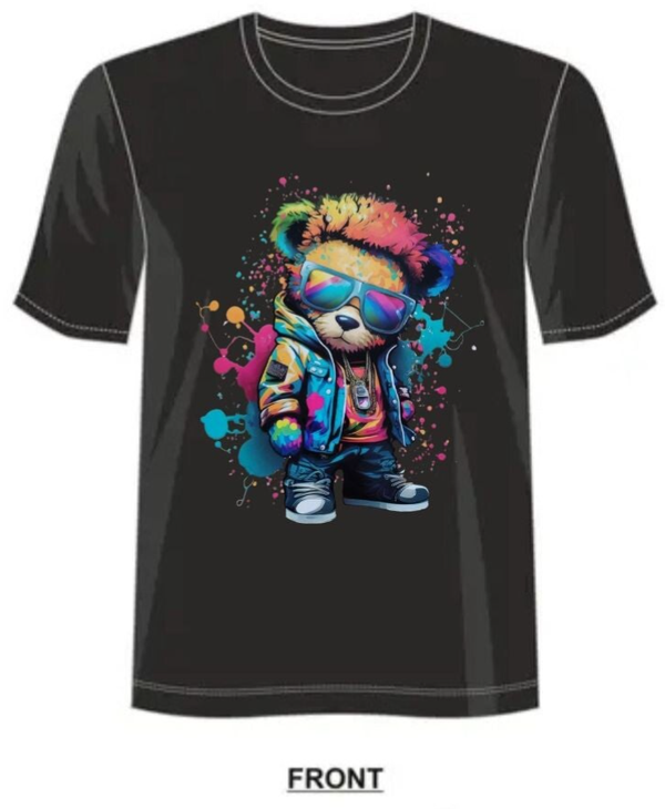 Ce t-shirt arbore un ourson stylé aux couleurs éclatantes, inspiré du graffiti et de la culture urbaine. Parfait pour un look casual, artistique et original.