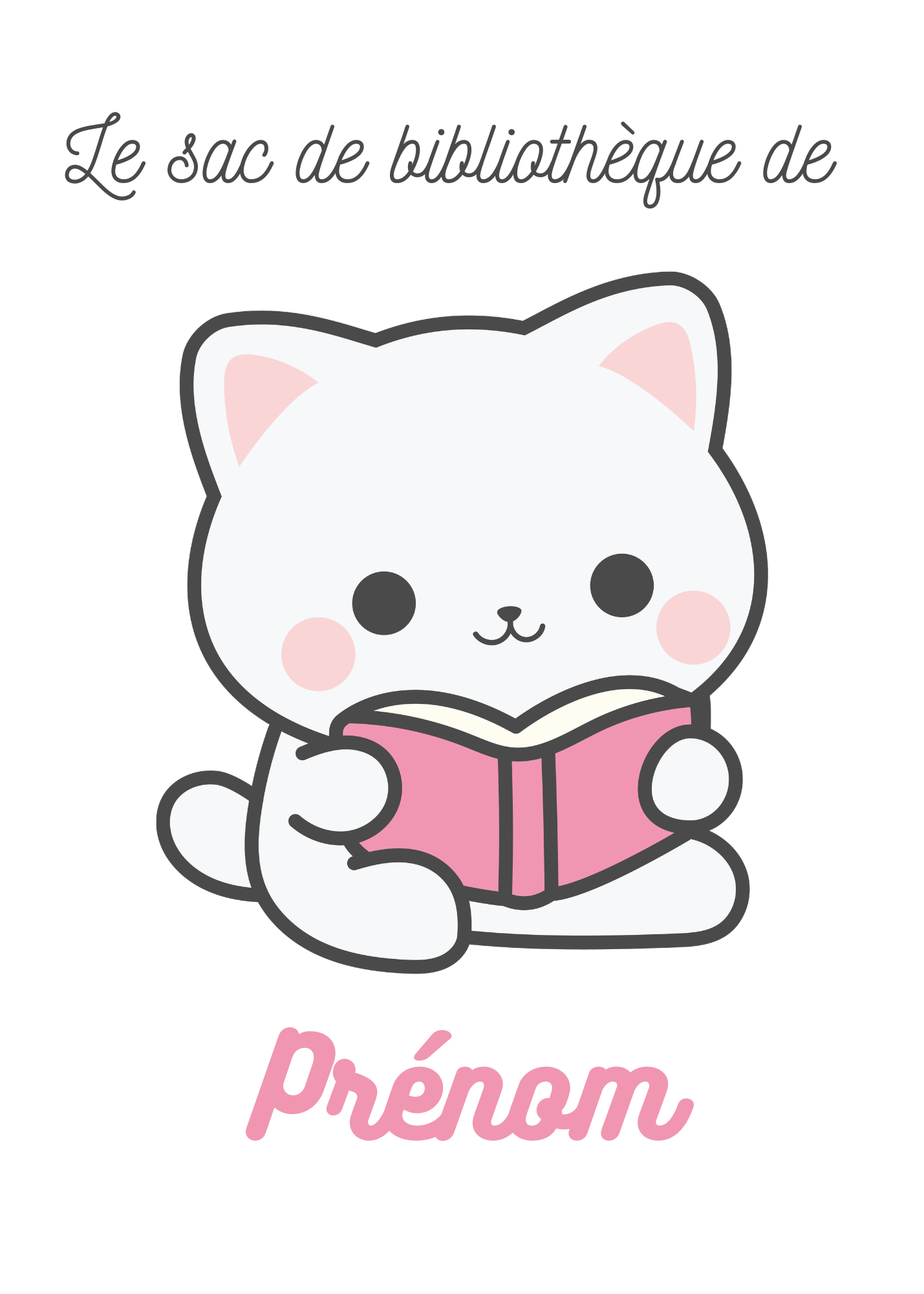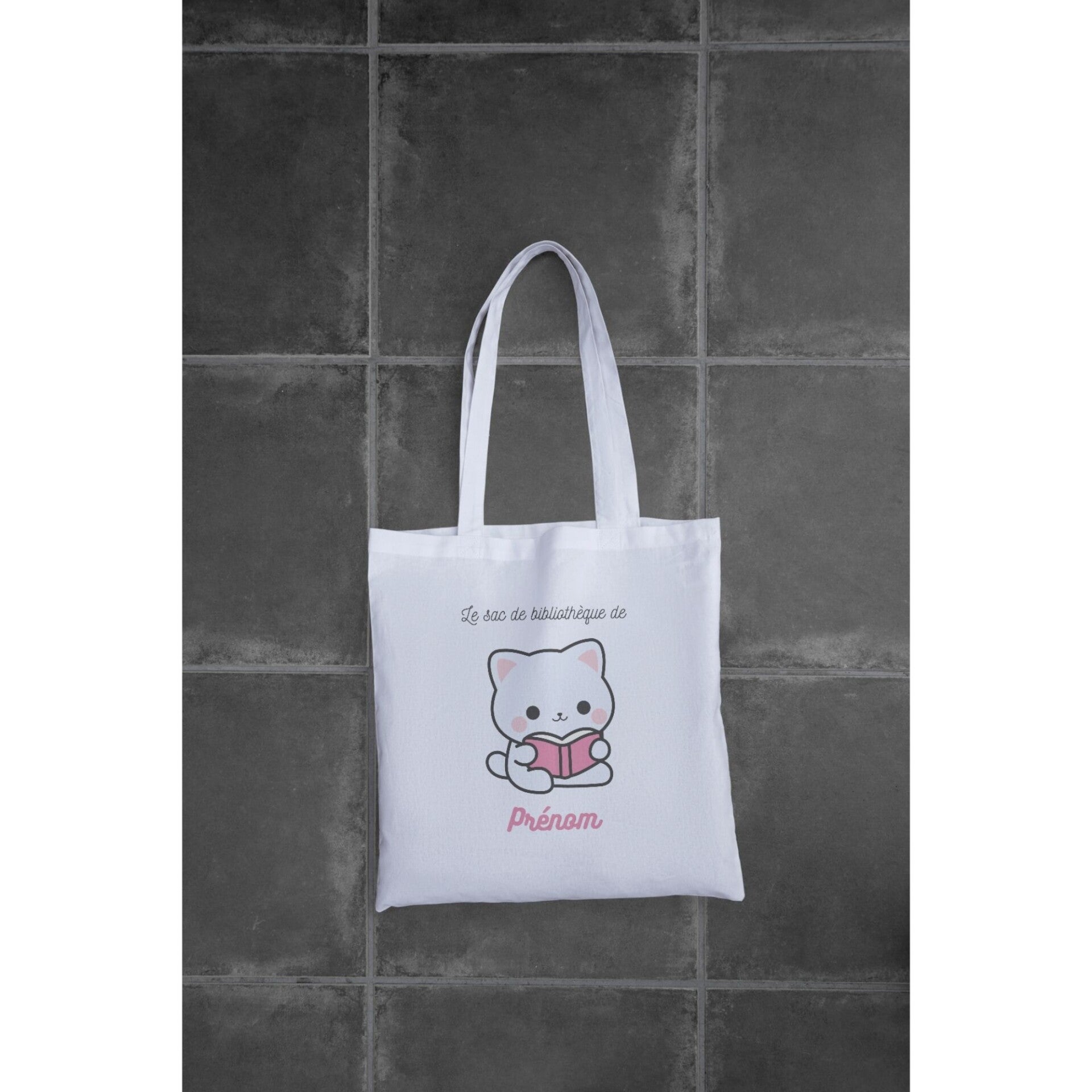 Un tote bag adorable pour accompagner les enfants à la bibliothèque, à l’école ou à la crèche. Avec son illustration d’un petit chat en train de lire et le texte « Le sac de bibliothèque de [Prénom] », ce sac devient un accessoire unique et pratique.