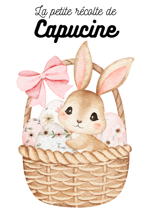 Craquez pour ce tote bag en toile personnalisé spécial Pâques, parfait pour accompagner les enfants lors de la traditionnelle chasse aux œufs. Avec son adorable illustration de petit lapin dans un panier rempli d’œufs, ce sac apporte une touche douce et festive à cette journée.